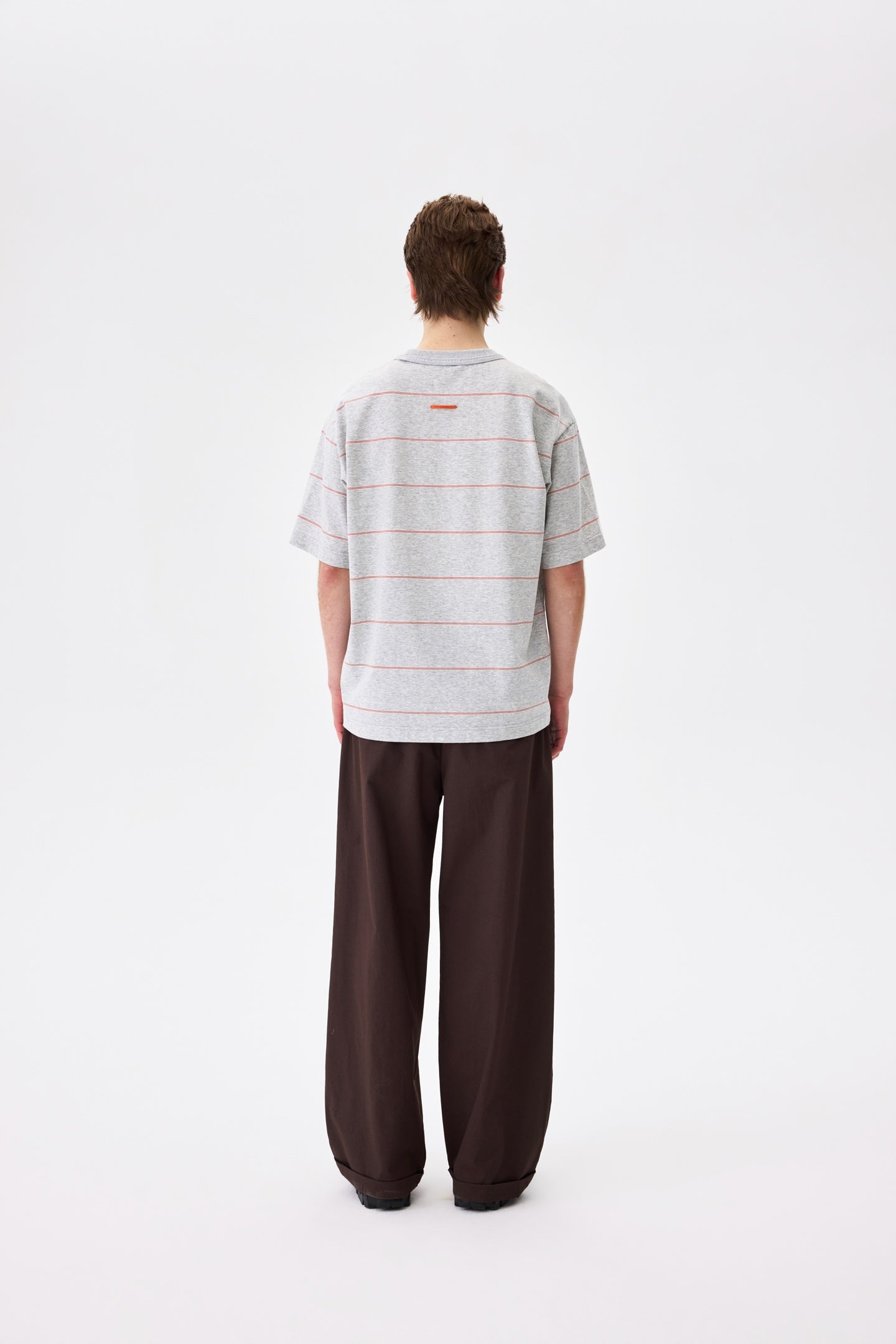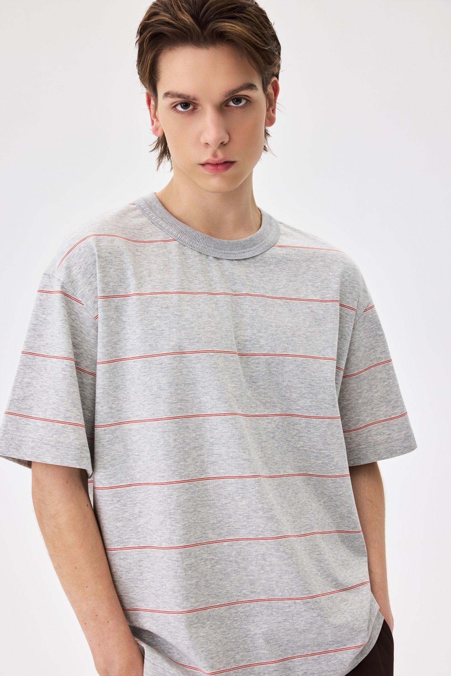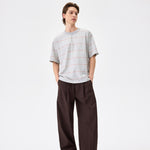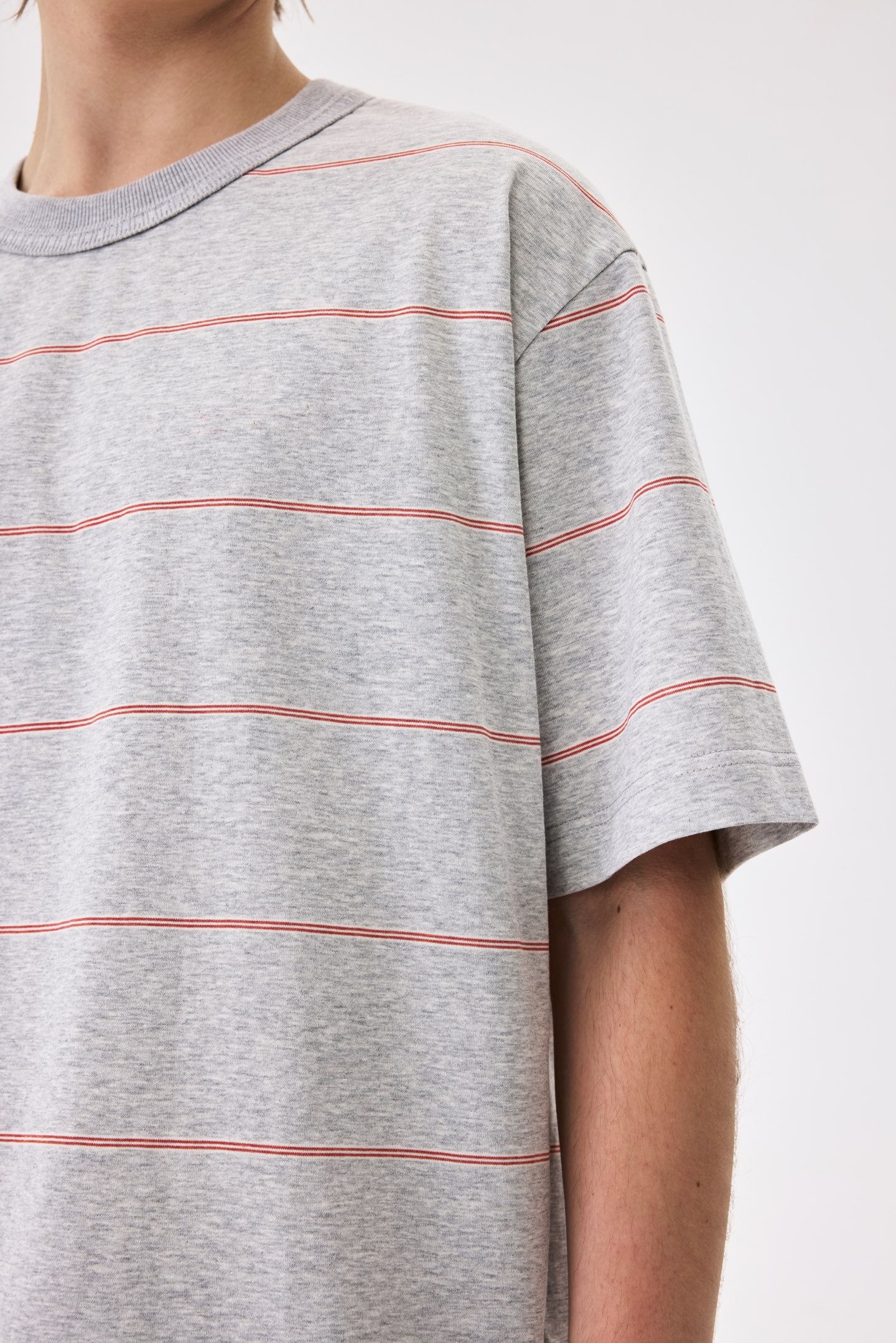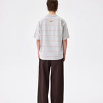 A striped tee in cool grey. 100% cotton with a relaxed fit. Pairs well with everything and tries too hard with nothing.