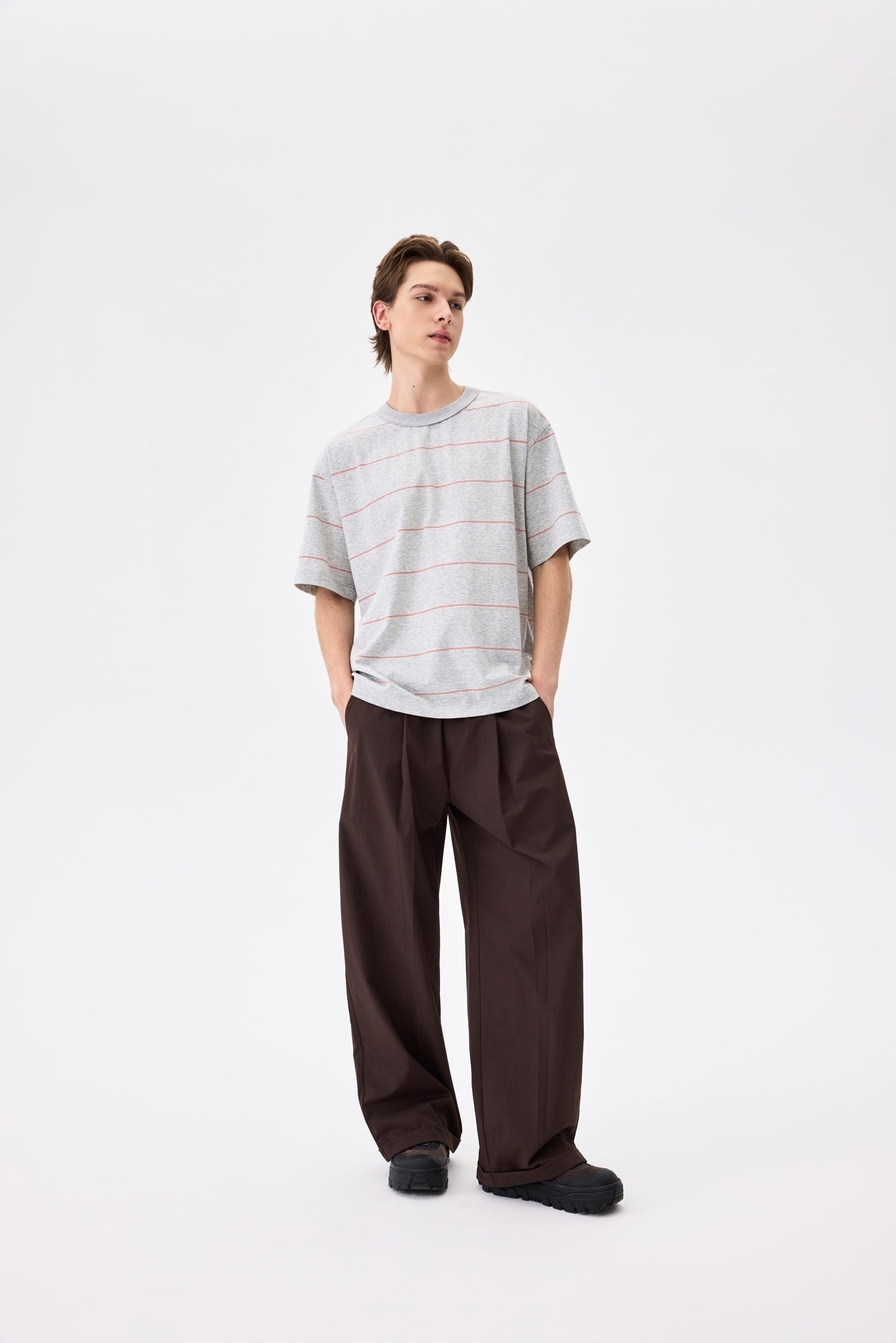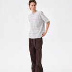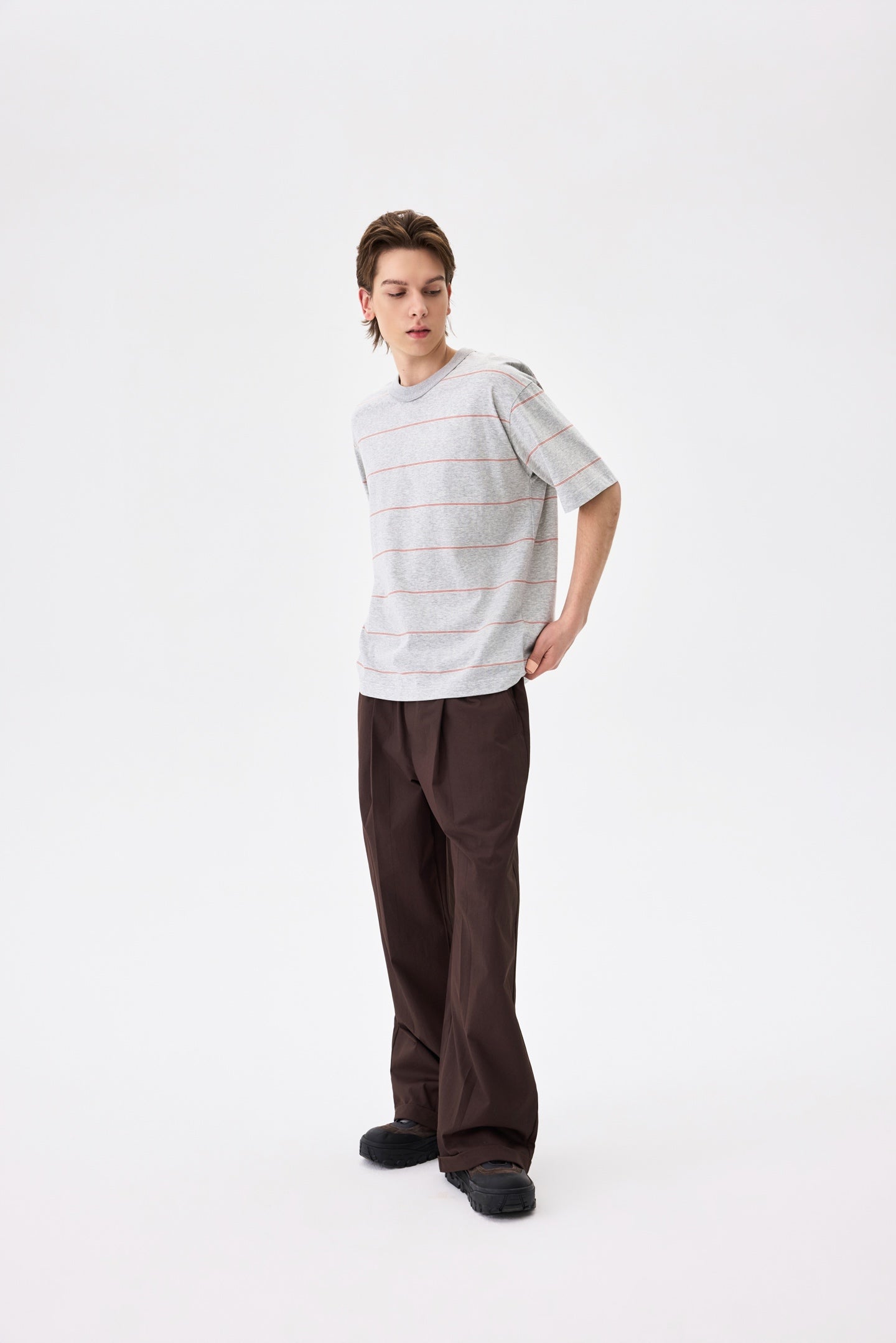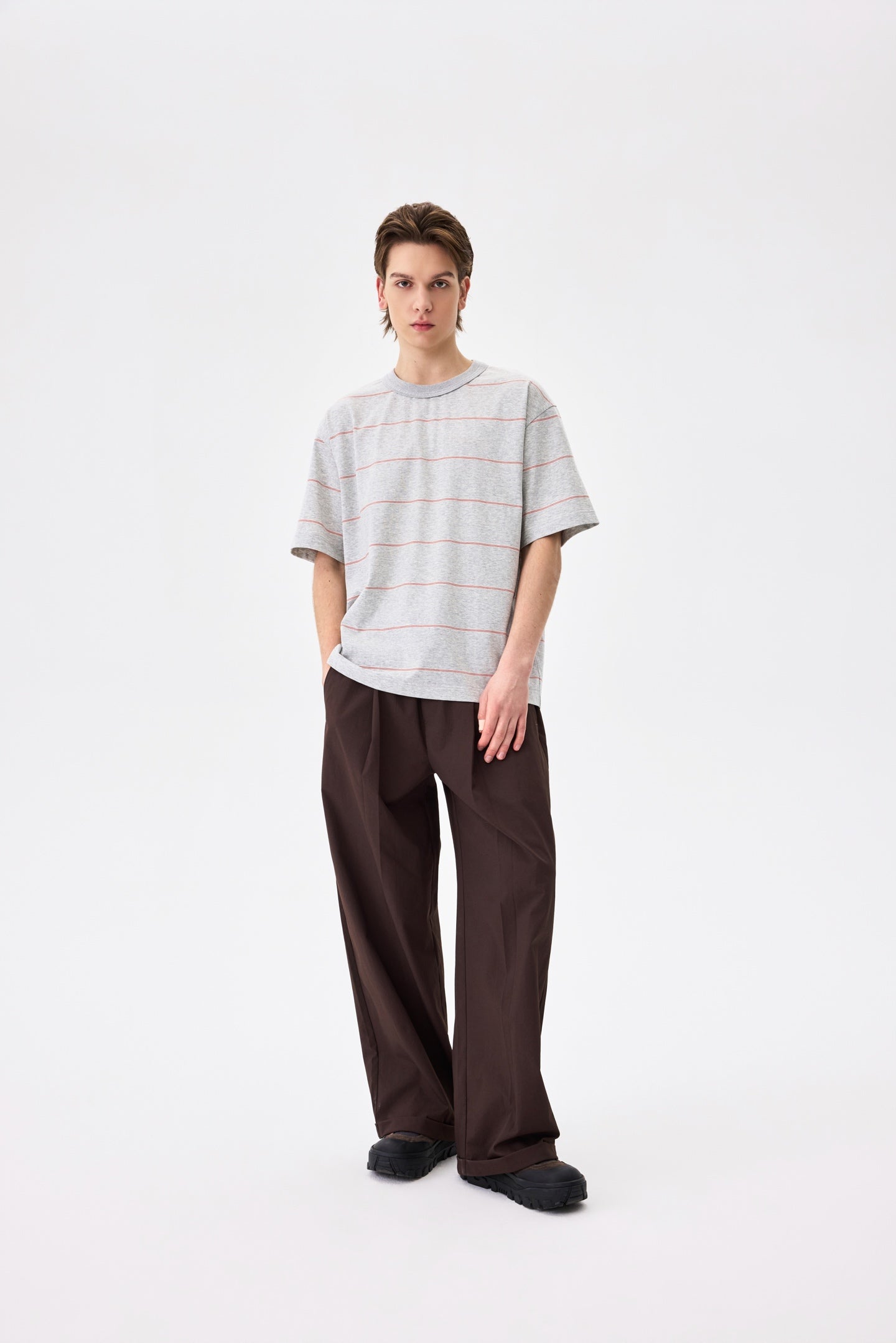 A striped tee in cool grey. 100% cotton with a relaxed fit. Pairs well with everything and tries too hard with nothing.