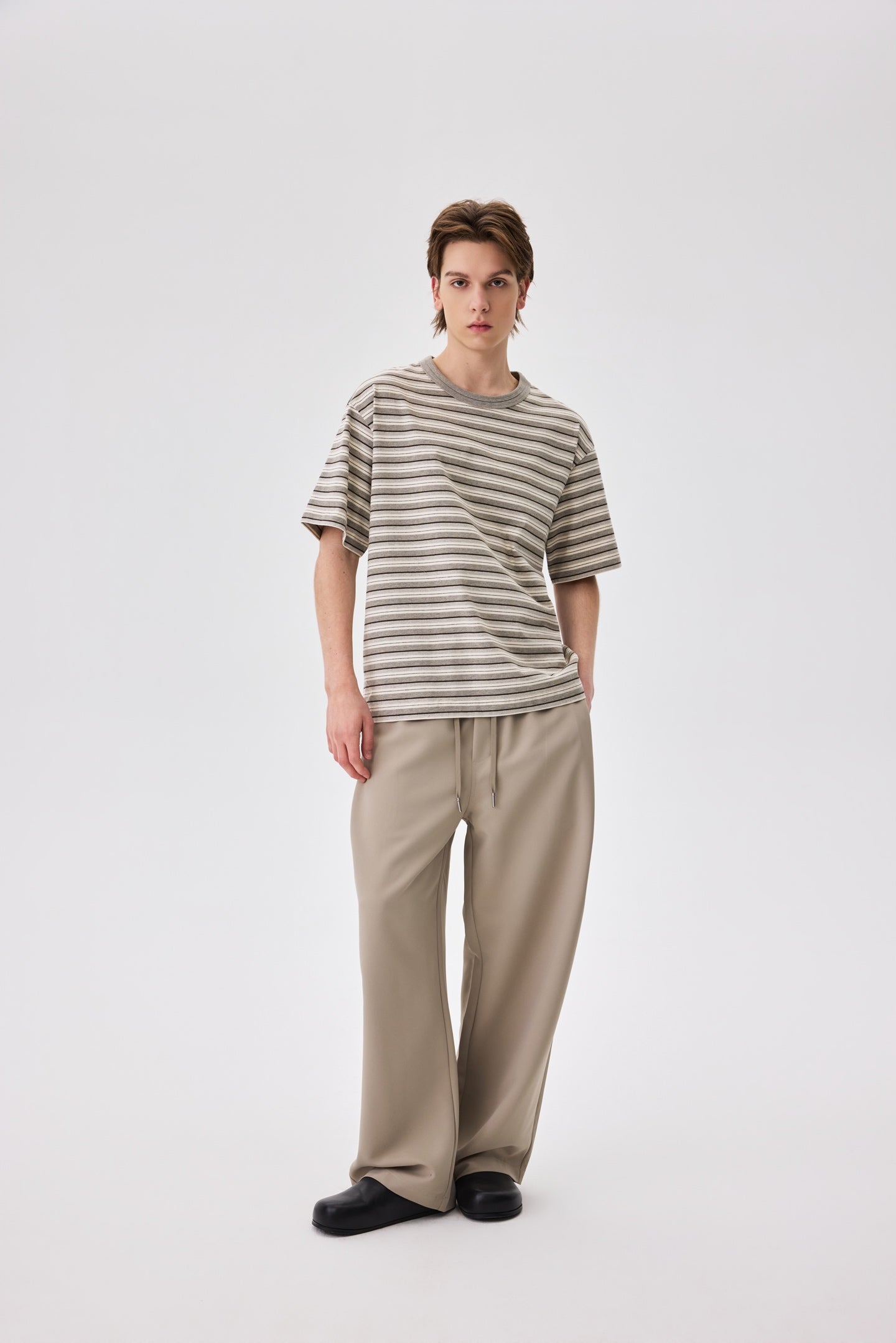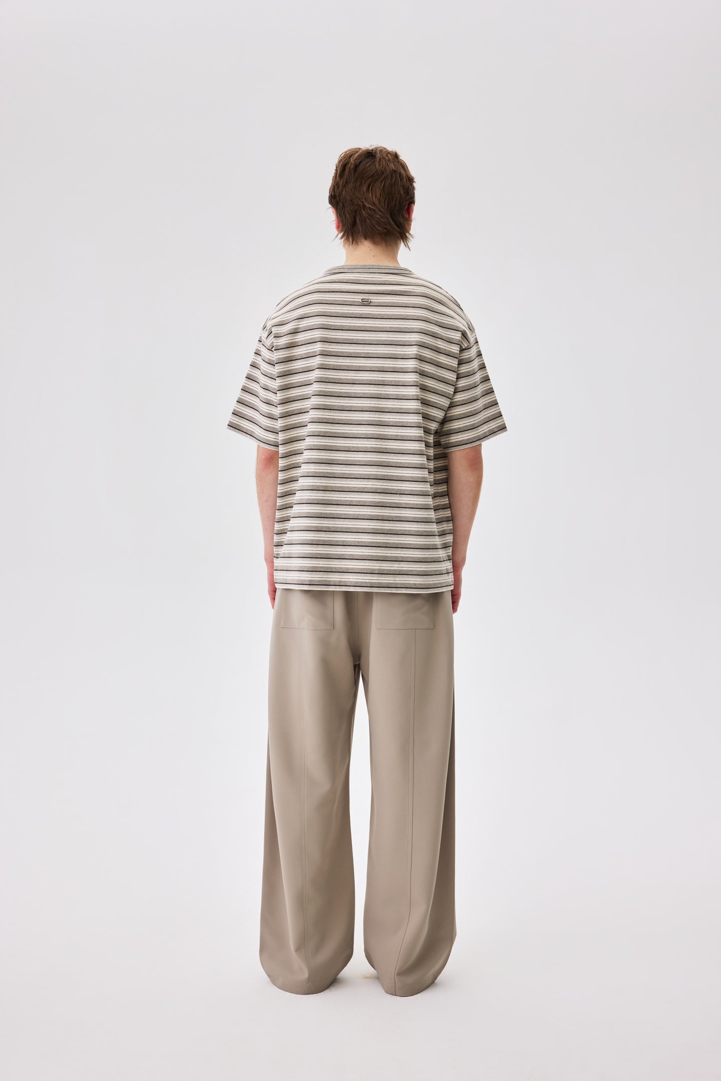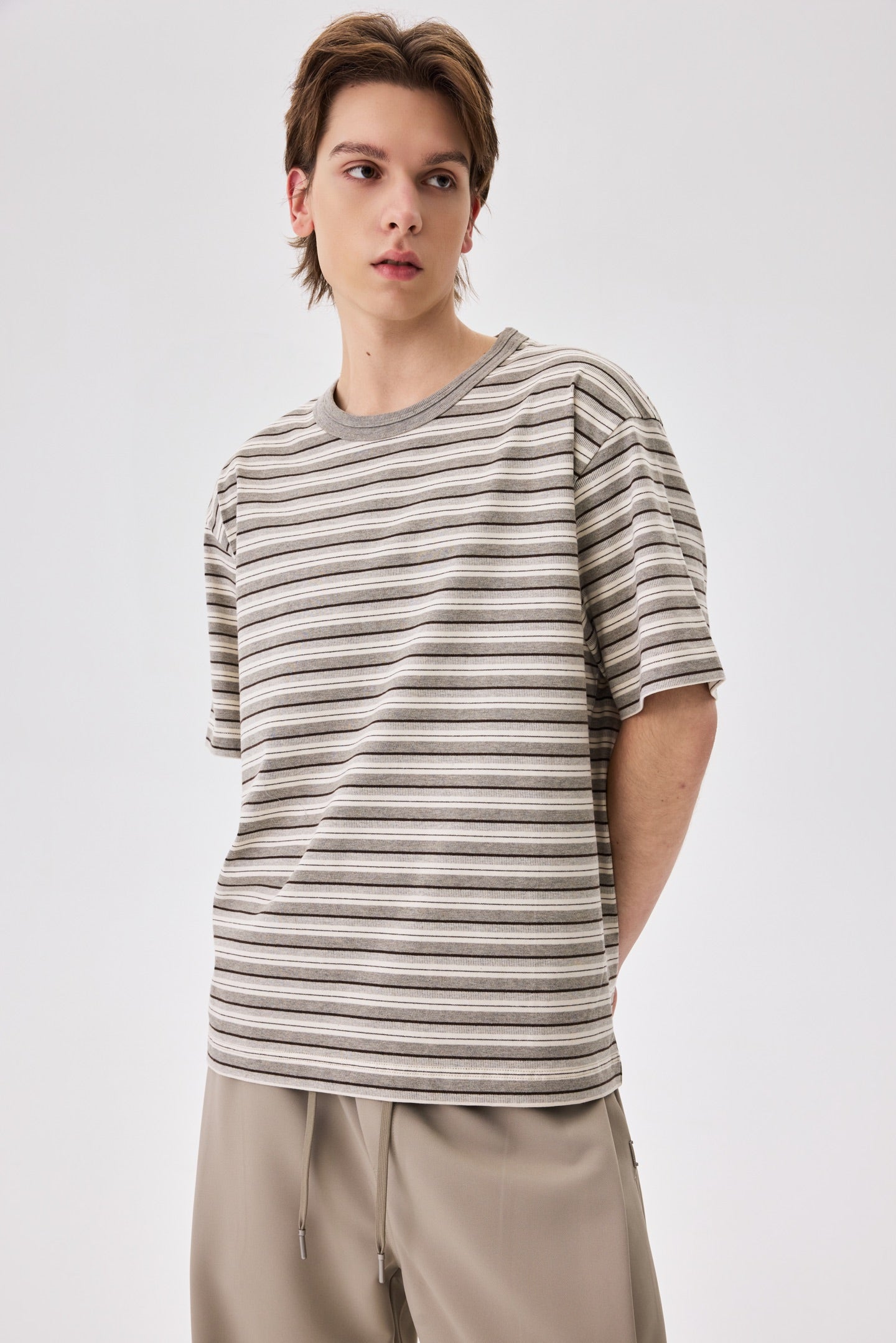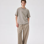 A striped tee in warm oat. 100% cotton with a relaxed fit. Clean lines and an easy, unhurried silhouette.