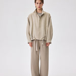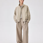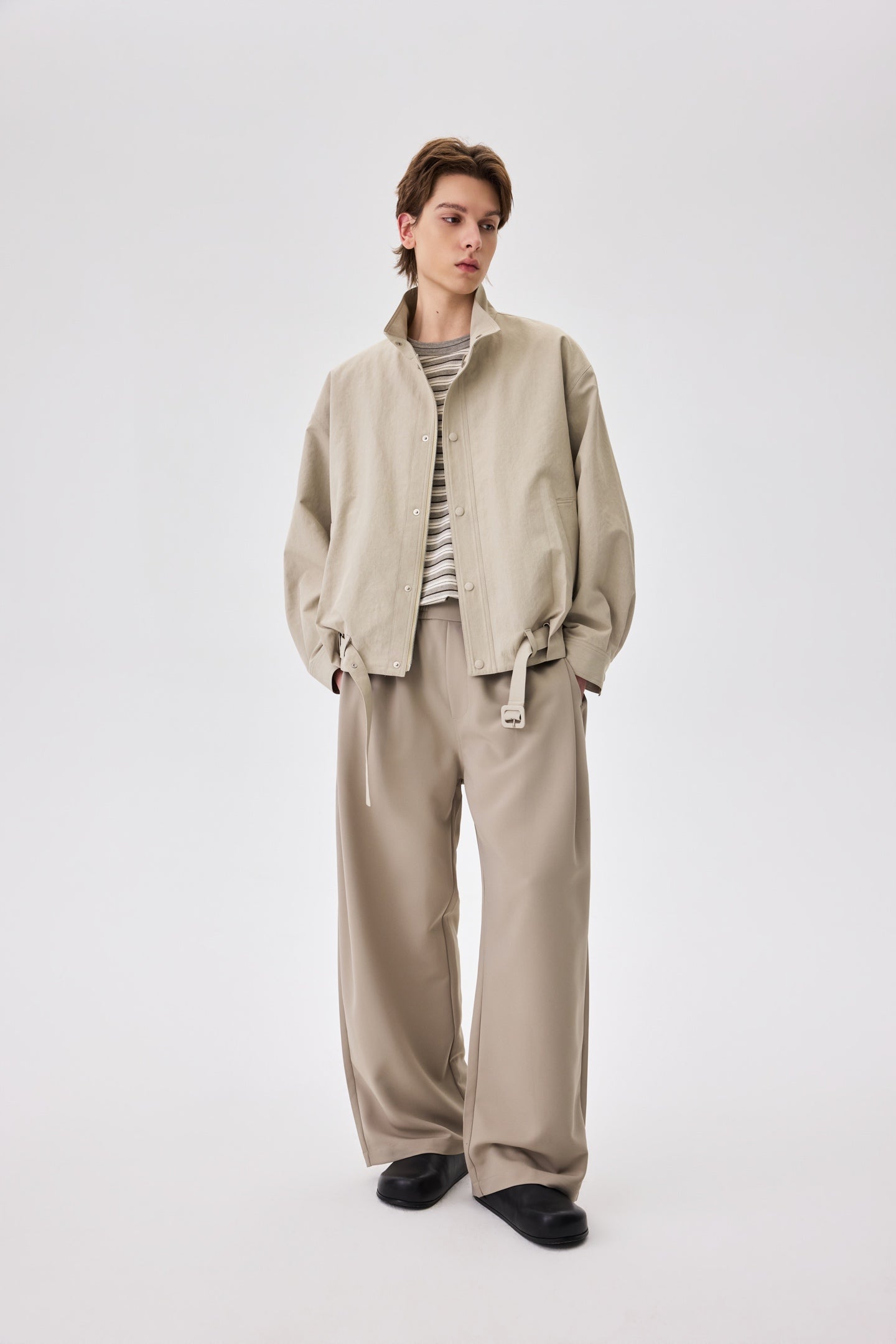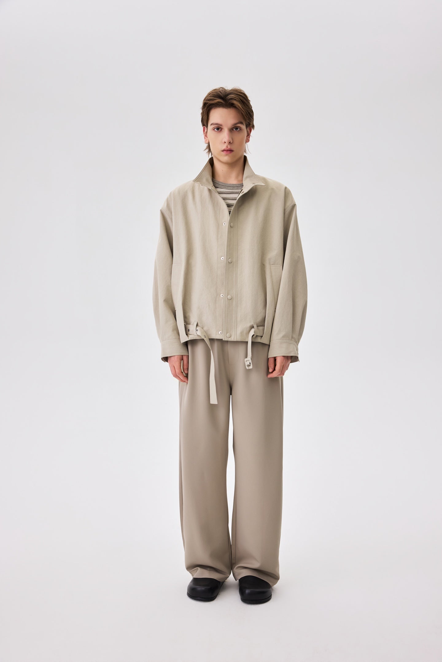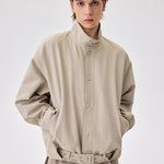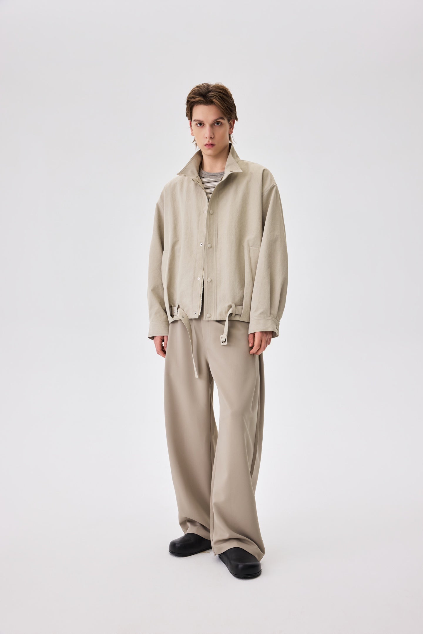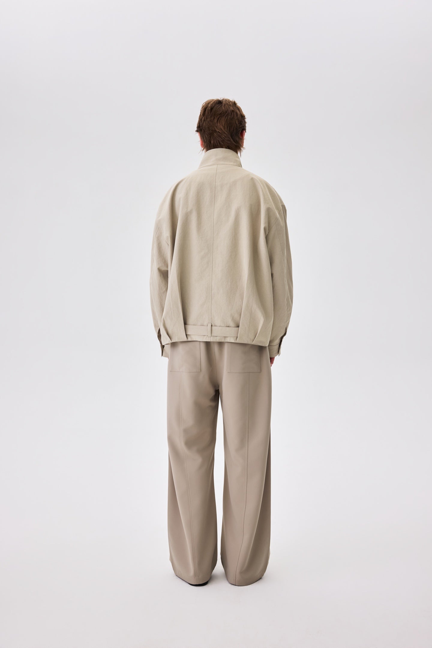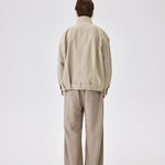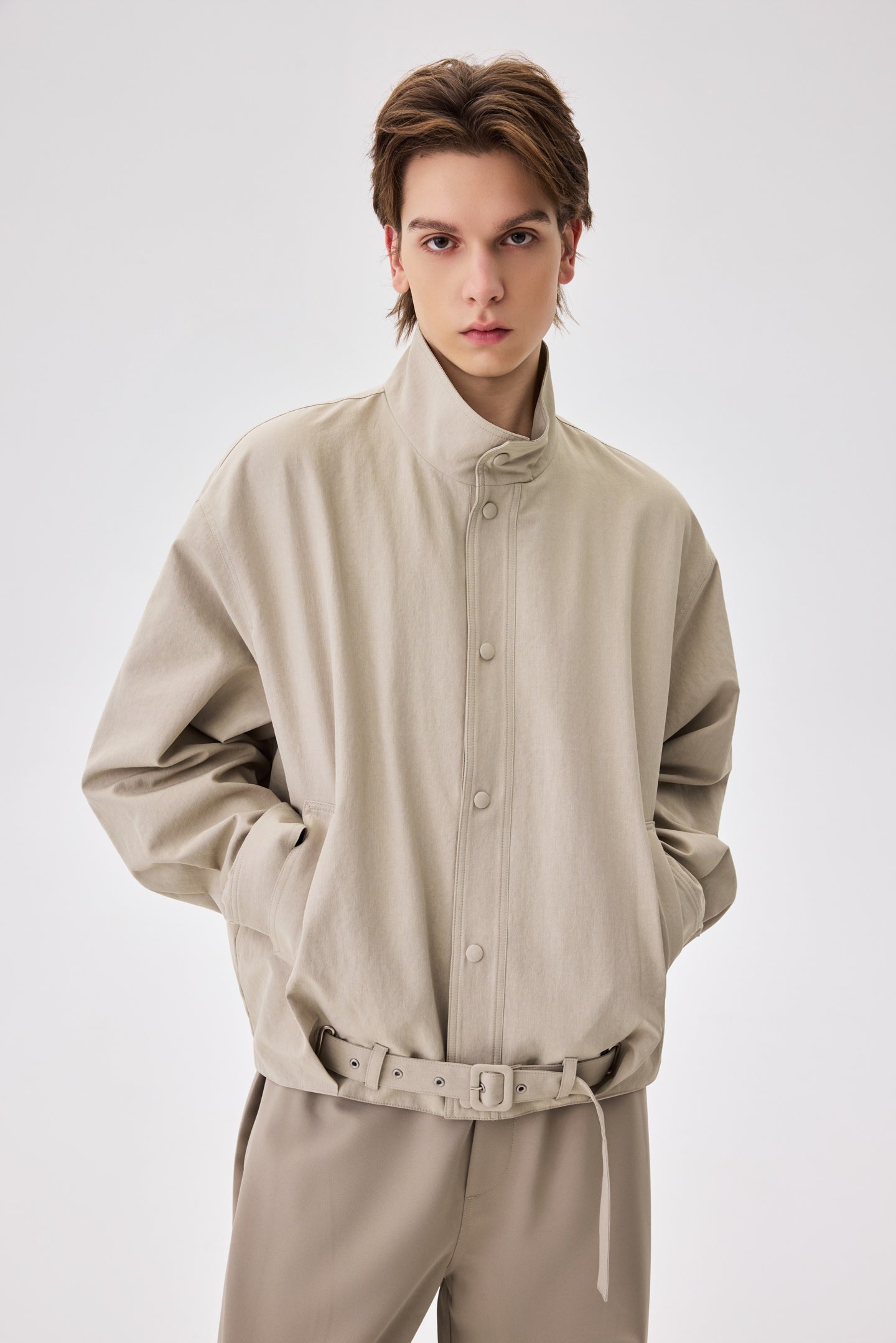 A lightweight jacket in warm tan with a zip front and adjustable belt at the waist. Easy to throw on, easy to wear. A quiet standout.