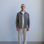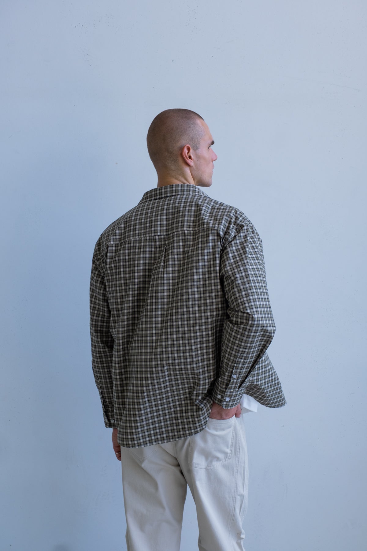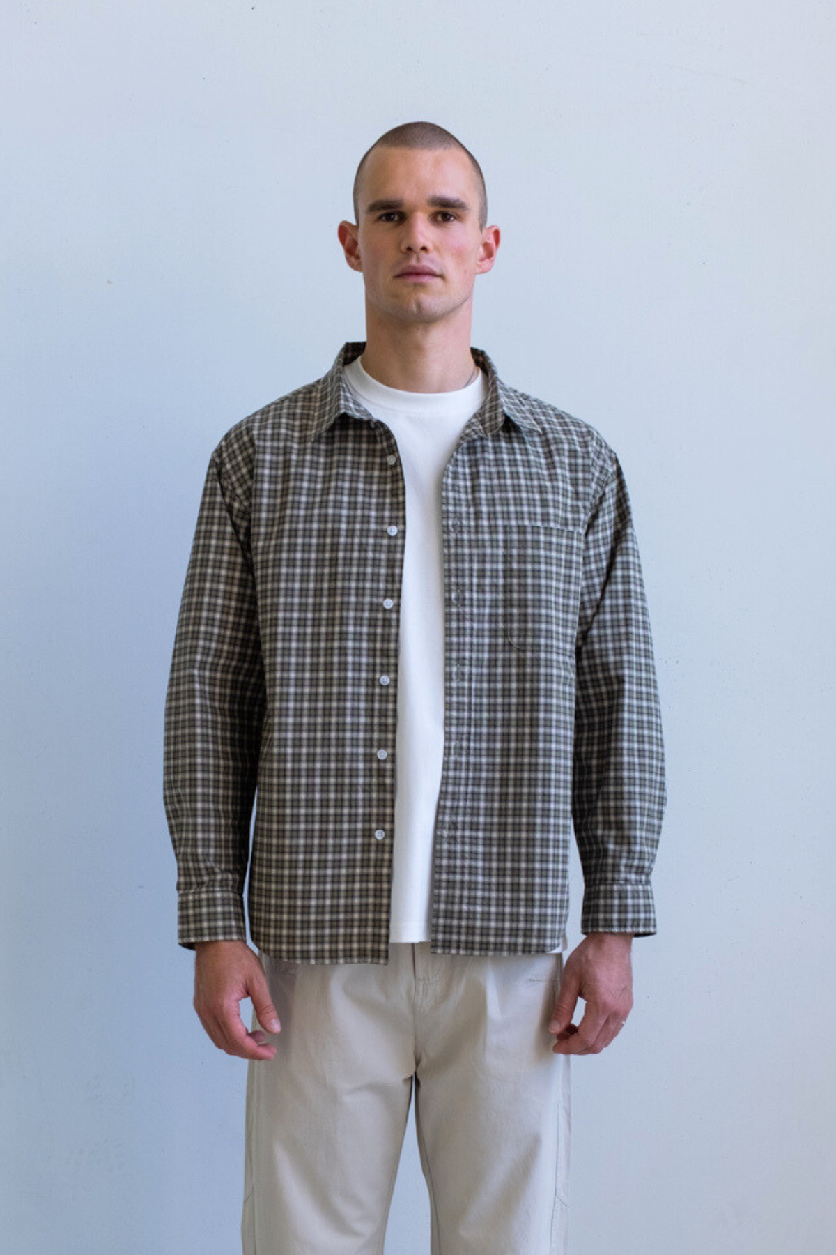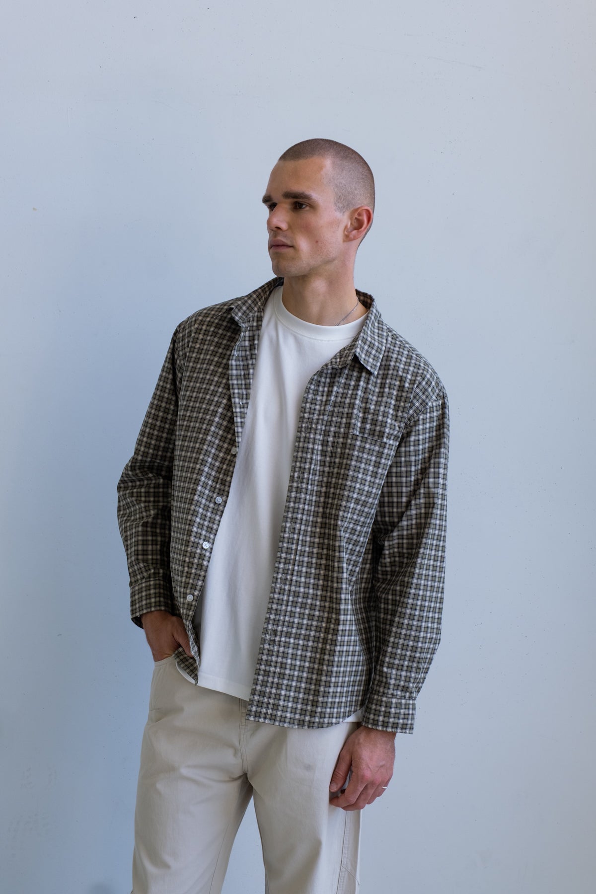 A relaxed long sleeve shirt cut from 100% cotton in a muted olive taupe micro-check. The midweight cotton has a smooth, breathable hand feel with light structure, giving the shirt shape without stiffness.