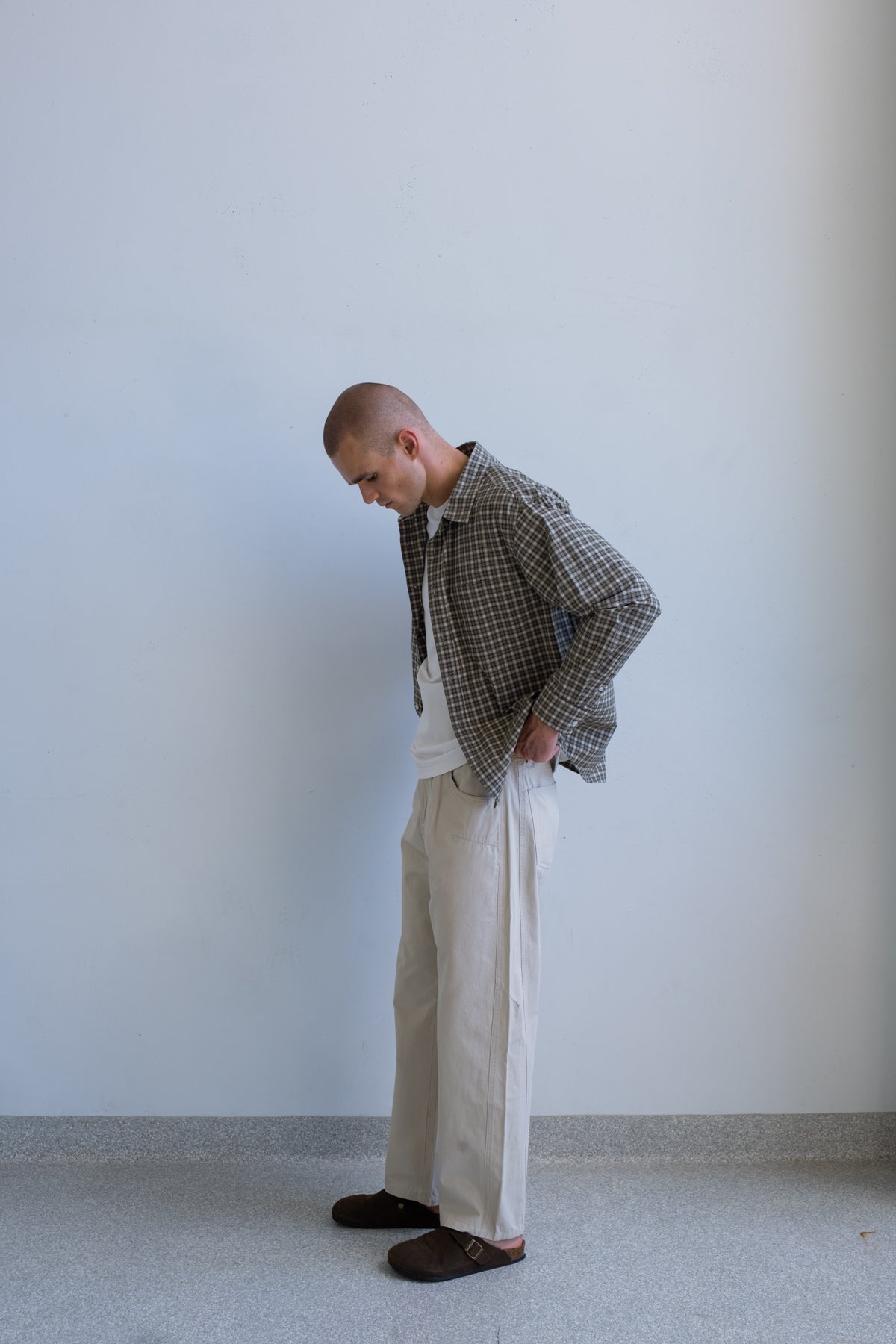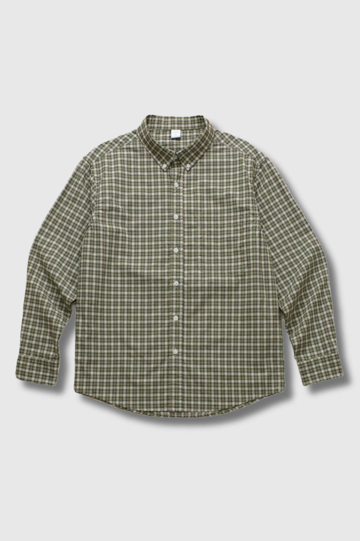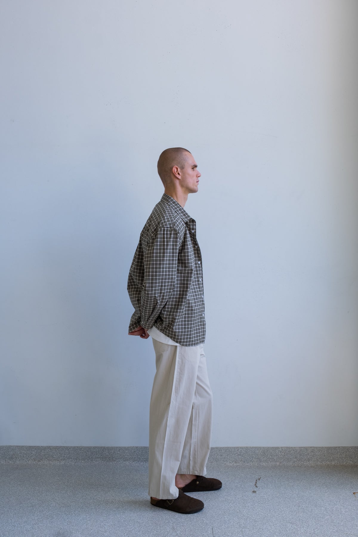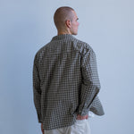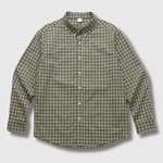 A relaxed long sleeve shirt cut from 100% cotton in a muted olive taupe micro-check. The midweight cotton has a smooth, breathable hand feel with light structure, giving the shirt shape without stiffness.