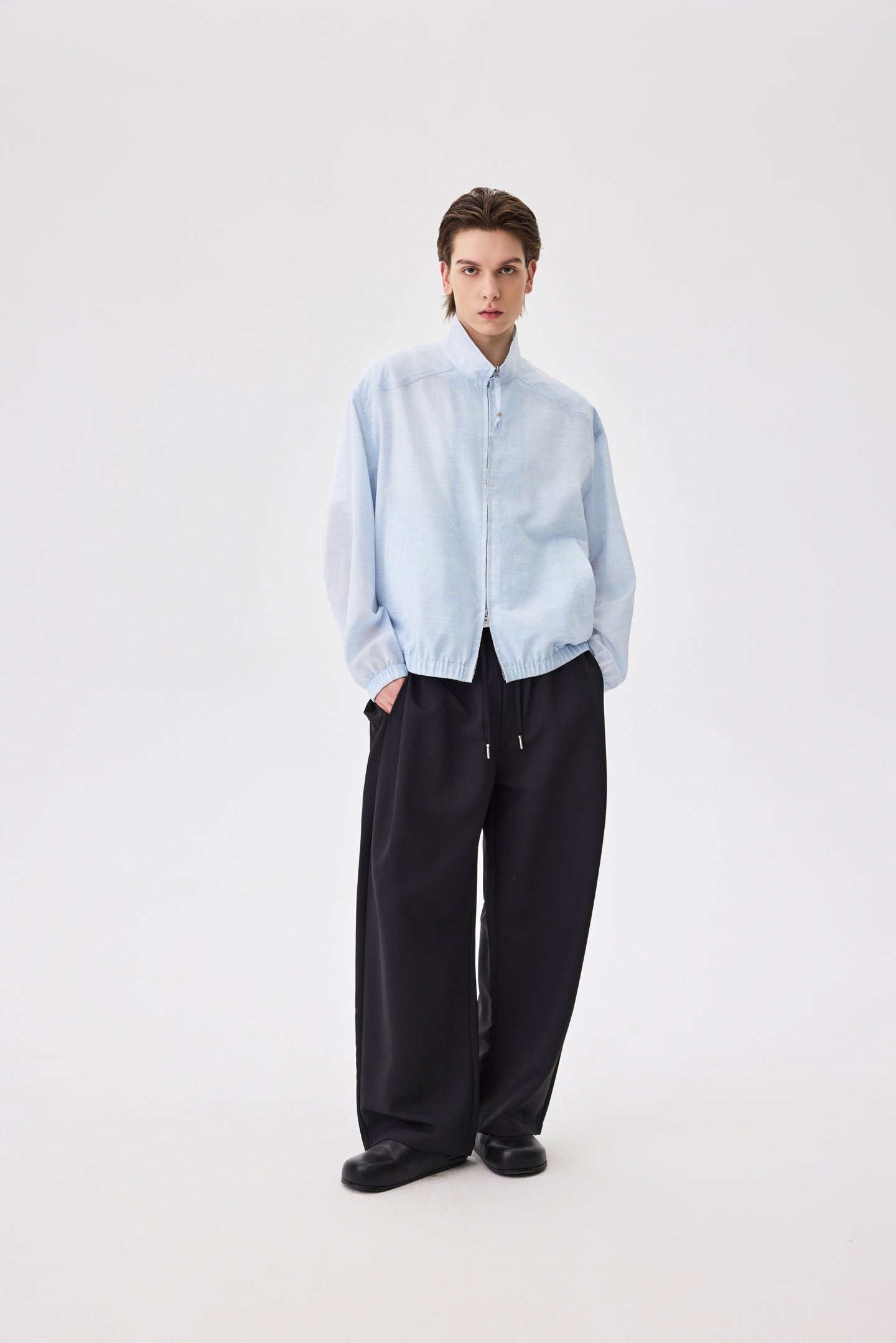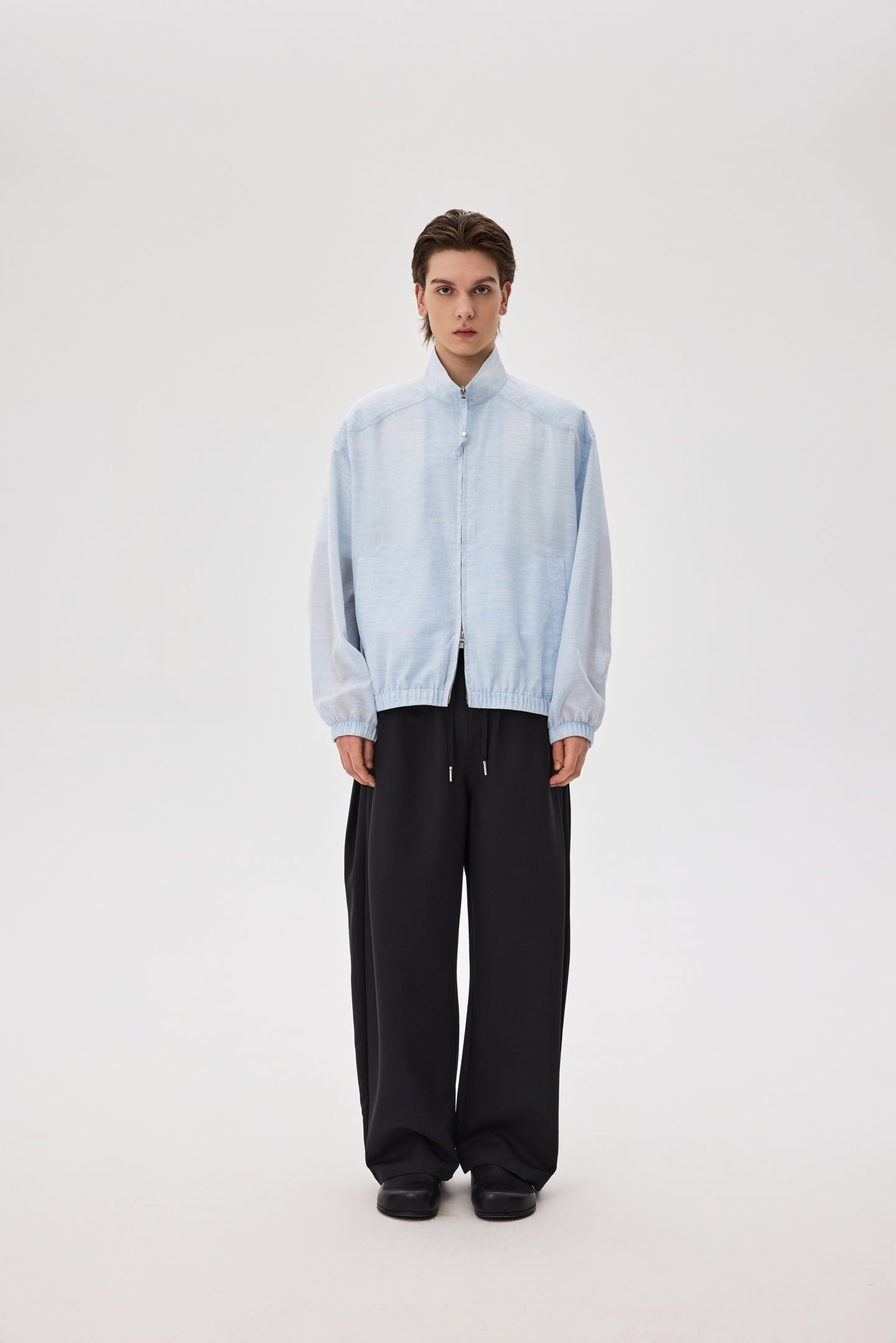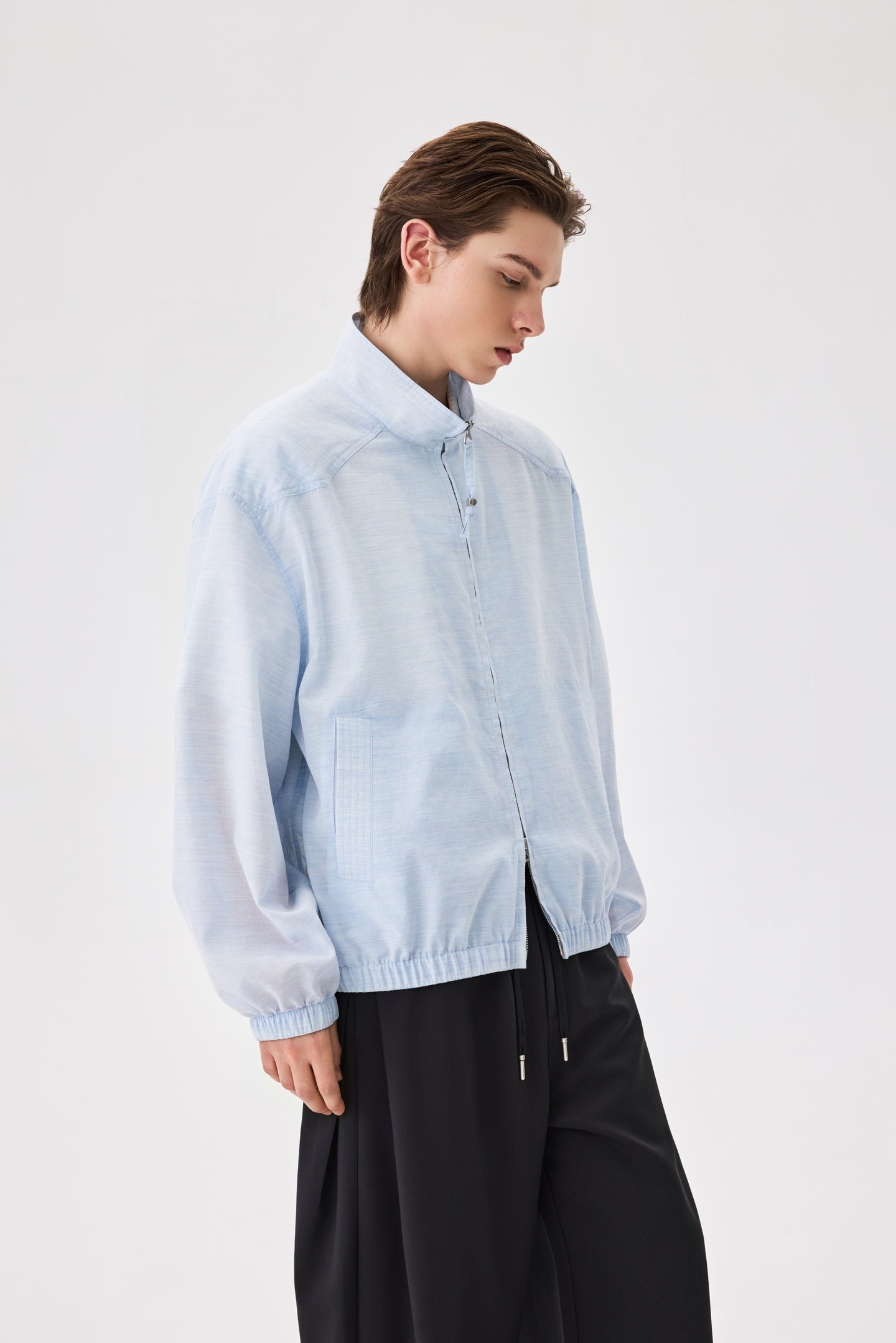 A relaxed jacket in pale blue with a soft collar and easy fit. Sits well open or buttoned. Built for the warmer months.