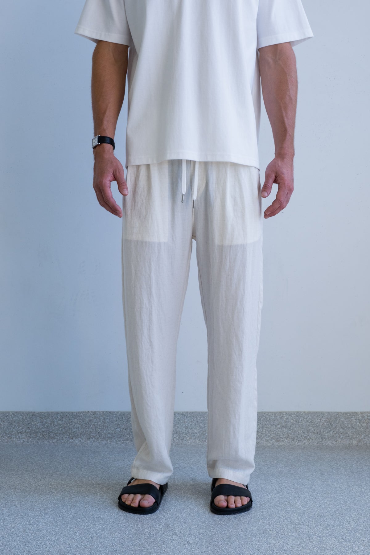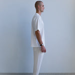 A relaxed straight leg, elastic waistband, and adjustable drawcord keep the fit effortless. Subtle texture in the fabric adds depth while maintaining a clean, minimal finish.