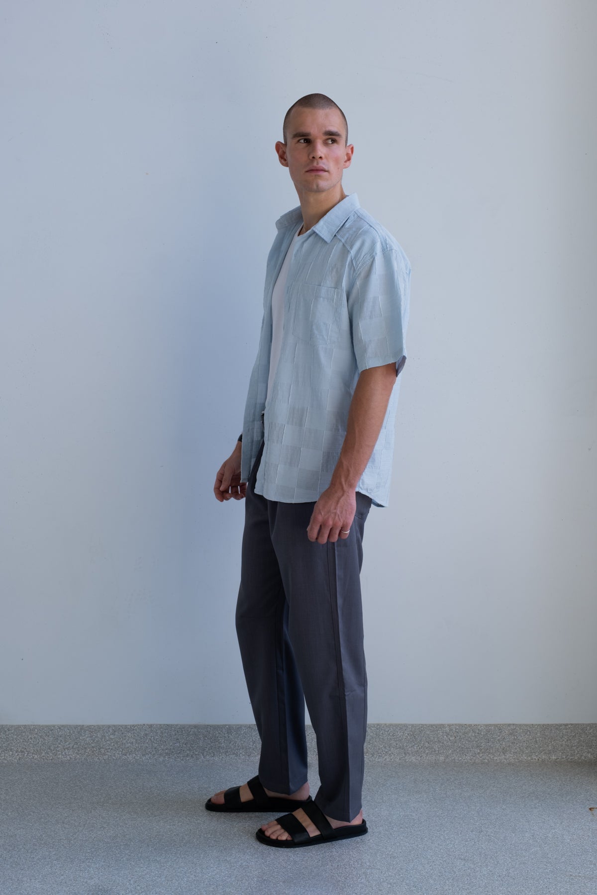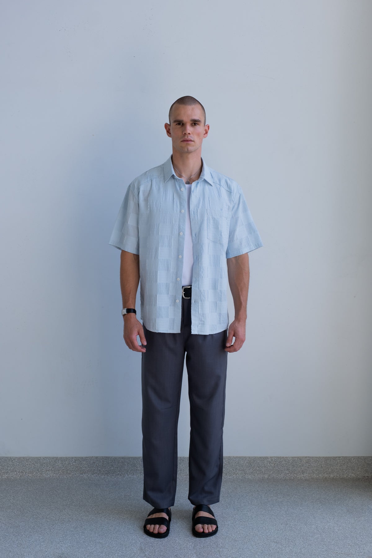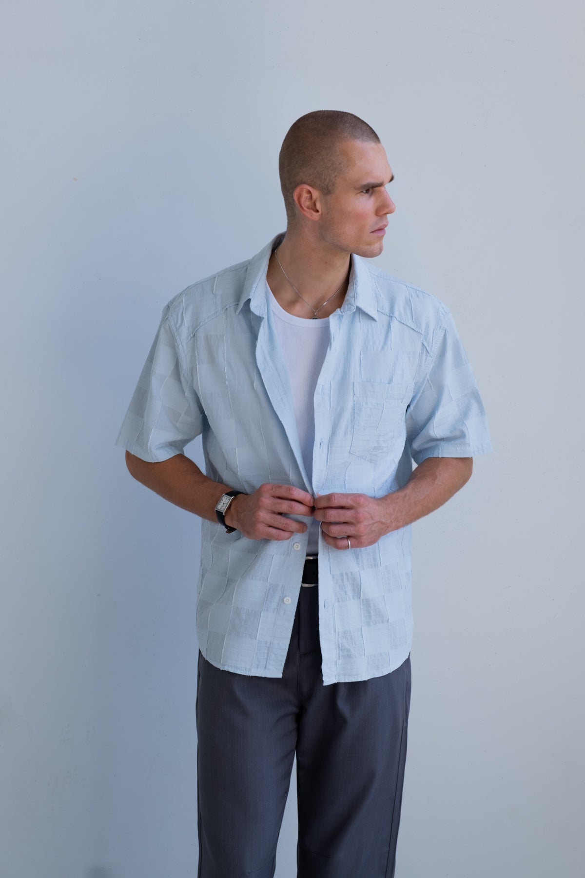 Lightweight, breathable, and cut to drape with ease, The Sebastian Shirt is built for warm days and clean layering. The cotton-viscose blend gives it structure through the collar and placket, with a softer, fluid hand feel that moves naturally on the body.